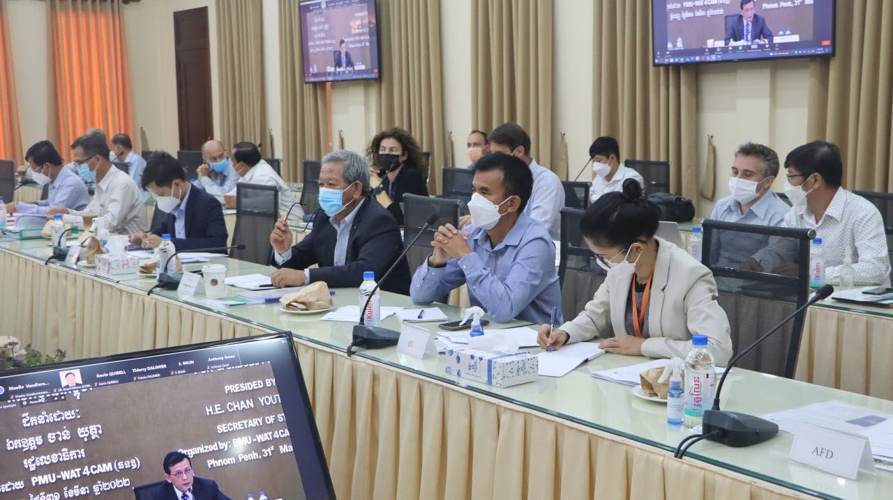 រសៀលថ្ងៃព្រហស្បតិ៍ ១៤រោច ខែផល្គុន ឆ្នាំឆ្លូវ ត្រីស័ក ពុទ្ធសករាជ ២៥៦៥ ត្រូវនឹងថ្ងៃទី៣១ ខែមីនា ឆ្នាំ២០២២ ឯកឧត្តម ចាន់ យុត្ថា រដ្ឋលេខាធិការនៃក្រសួងធនធានទឹក និងឧតុនិយម និងជាប្រធានគណៈកម្មការដឹកនាំកម្មវិធី (PSC-WAT4CAM) បានដឹកនាំកិច្ចប្រជុំពិភាក្សាគណៈកម្មាកាដឹកនាំកម្មវិធីលើកទី៣ ដោយមានសមាជិកចូលរួមមកពី ក្រសួងសេដ្ឋកិច្ច និងហិរញ្ញវត្ថុ, ក្រសួងកសិកម្ម រុក្ខាប្រម៉ាញ់ និងនេសាទ, ក្រសួងអភិវឌ្ឍន៍ជនបទ, ក្រសួងរៀបចំដែនដី នគររូបនីយ៏កម្ម និងសំណង់, ក្រសួងពាណិជ្ជកម្ម, ក្រសួងបរិស្ថាន, ក្រុមប្រឹក្សាអភិវឌ្ឍន៍កម្ពុជា (SNEC), ទីភ្នាក់ងារបារាំងសម្រាប់ការអភិវឌ្ឍ (AFD), សហគមន៍អឺរ៉ុប (EU), ក្រុមការងារកម្មវិធី (PMU) & 5-PIU និងទីប្រឹក្សាបច្ចេកទេសរបស់កម្មវិធី (WAT4CAM) ទាំងអស់ចូលរួមផងដែរ ។