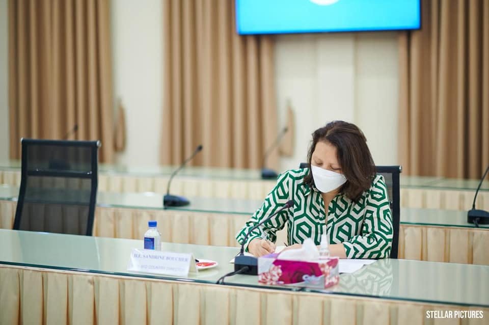 លោកស្រី Sandrine Boucher ដែលនឹងត្រូវមកទទួលការងារថ្មីនាពេលខាងមុខនេះ បានបង្ហាញនូវសេចក្តីរីករាយ ដោយបានជួបពិភាក្សាការងារដោយផ្ទាល់ជាមួយឯកឧត្តមរដ្ឋមន្រ្តី នាពេលនេះ និងបានវាយតម្លៃខ្ពស់ចំពោះសមិទ្ធផលការងារលើវិស័យធនធានទឹក និងឧតុនិយម ដែលក្រសួងសម្រេចបាន ក៏ដូចជាកិច្ចការបន្តដែលត្រូវអនុវត្តក្នុងបេសកកម្មរួមចំណែកដល់ការអភិវឌ្ឍ និងការរីកលូតលាស់សេដ្ឋកិច្ចប្រទេសកម្ពុជាឲ្យបានកាន់តែប្រសើរថែមទៀត និងបានបង្ហាញនូវការប្តេជ្ញាចិត្តបន្តរួមចំណែកជួយ ដើម្បីធ្វើឲ្យសេដ្ឋកិច្ចកម្ពុជា ក៏ដូចជាវិស័យធនធានទឹក មានការវិវត្តន៍រីកចម្រើនតទៅមុខ ។