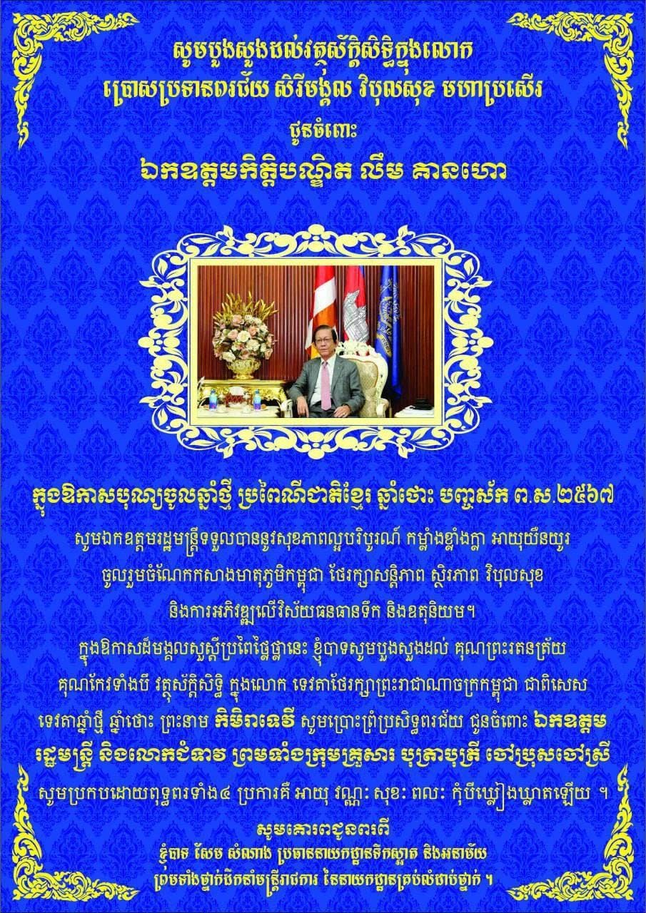 ក្នុងឱកាសដ៏មហោឡារិកនេះ យើងខ្ញុំទាំងអស់គ្នាសូមបួងសួងដល់គុណបុណ្យ ព្រះរតនត្រ័យ កែវទាំងបី វត្ថុស័ក្ដិសិទ្ធិក្នុងលោក ជាពិសេសទេវតាឆ្នាំថ្មី ព្រះនាង កិមិរាទេវី សូមប្រោះព្រំសព្ទសាធុការពរ សិរីសួស្ដី ជ័យមង្គលវិបុលសុខ បវរមហាប្រសើរថ្លៃថ្លាជូនចំពោះ ឯកឧត្តម ព្រមទាំងក្រុមគ្រួសារ សូមមានសុខភាពល្អបរិបូរណ៍ ពលានុភាពមាំមួន ជន្មាយុយឺនយូរ និងសូមទទួលបាននូវជោគជ័យថ្មីៗថែមទៀត ដើម្បីបន្តការចូលរួមកសាង និងអភិវឌ្ឍមាតុភូមិកម្ពុជាឆ្ពោះទៅរកសុខសន្តិភាព ស្ថិរភាព វិបុលភាព និងអភិវឌ្ឍន៍។