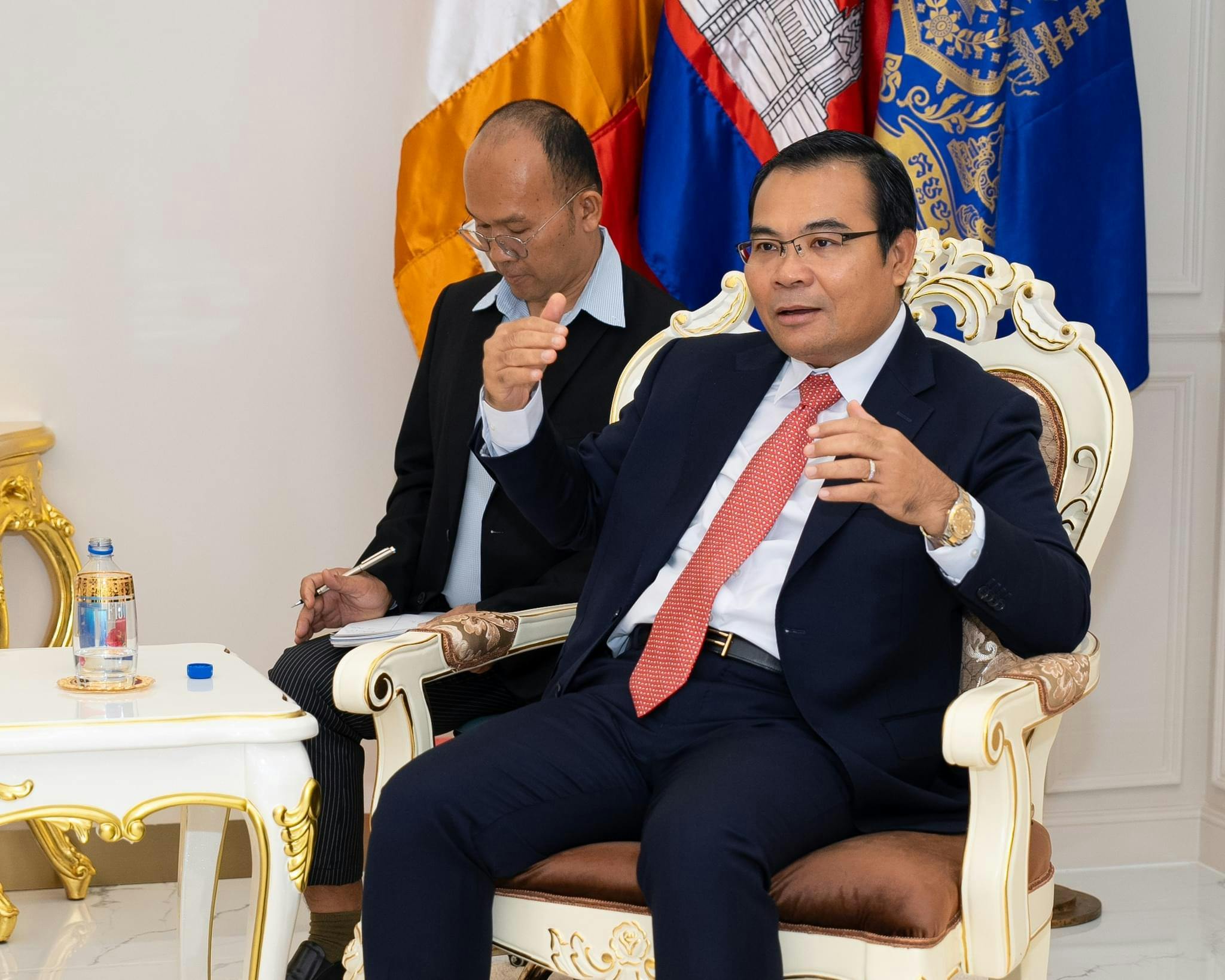 ឯកឧត្តមរដ្ឋមន្ត្រីបានបញ្ជាក់ប្រាប់ប្រតិភូក្រុមបេសកកម្មបារាំងថា ក្រសួងធនធានទឹក និងឧតុនិយមកំពុងបន្តកសាងហេដ្ឋារចនាសម្ព័ន្ធ និងអភិវឌ្ឍន៍វិស័យធនធានទឹក និងឧតុនិយម ដើម្បីធានាបាននូវសុវត្ថិភាពទឹក ឆ្លើយតបទៅនឹងការប្រែប្រួលអាកាសធាតុ ស្របតាមយុទ្ធសាស្ត្របញ្ចកោណដំណាក់កាលទី១ នៃរាជរដ្ឋាភិបាលនីតិកាលទី៧ នៃរដ្ឋសភាដែលបានកំណត់យកទឹកជាវិស័យអាទិភាពមួយក្នុងចំណោមអាទិភាពគន្លឹះចំនួន ៥ គឺមនុស្ស ផ្លូវ ទឹក ភ្លើង និងបច្ចេកវិទ្យា។